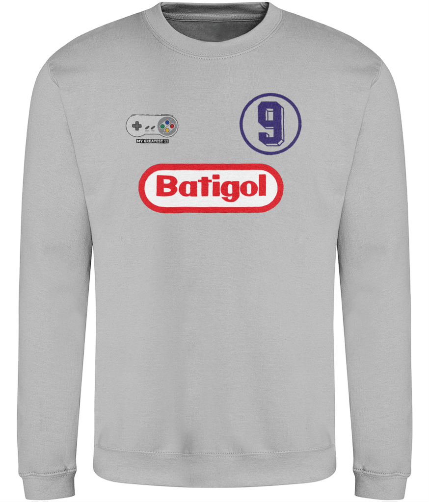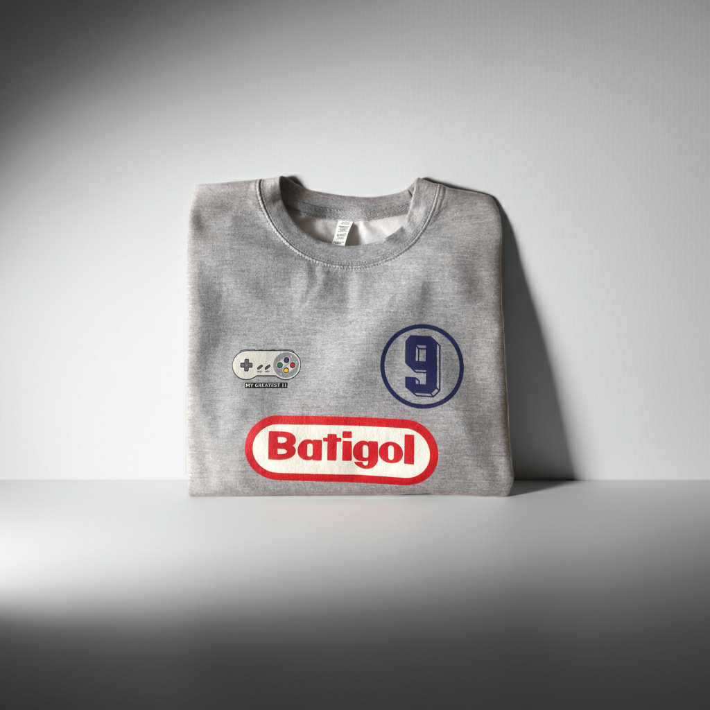 Pay tribute to one of football’s most iconic goal scorers with the Batistuta “Batigol” Fiorentina sweatshirt, inspired by classic Super Nintendo aesthetics. Blending retro gaming style with 90s Serie A nostalgia, this design celebrates Gabriel Batistuta’s legendary Fiorentina days when his thunderous strikes and fierce passion lit up Italian football.